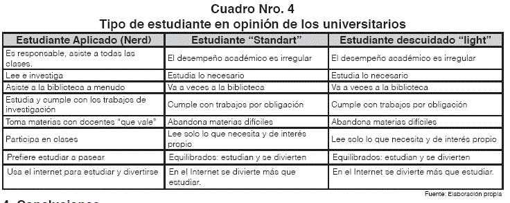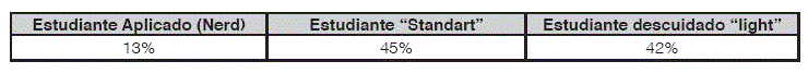La información obtenida permite caracterizar tres tipos de estudiantes: el estudiante aplicado denominado "nerd", el menos estudioso "estándar" y el descuidado "light".