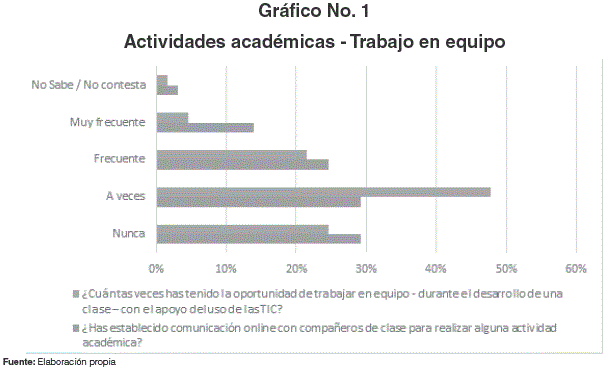 De acuerdo al Gráfico No.1, alrededor del 80% de los estudiantes han utilizado herramientas tecnológicas para trabajar en equipo en aula, sin embargo el 60% de ellos no ha tenido una participación online en actividades académicas, lo cual determina que docentes y estudiantes deben fomentar el uso de foros, debates, o consultas en línea para así enriquecer los conocimientos adquiridos.
