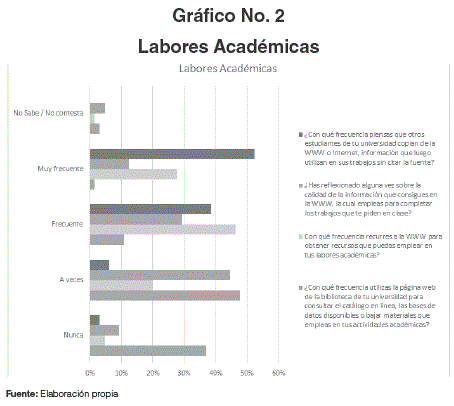 En el Gráfico No. 2 más del 50% de los estudiantes utiliza el Internet solo para copiar trabajos, sin una reflexión positiva, se justifica que no se utiliza TIC correctamente, por ello se debe fomentar que las labores académicas estén bajo responsabilidad y ética, así también la Universidad debe dar a conocer plataformas para consultas en línea, con bases de datos y materiales guiados a actividades académicas.