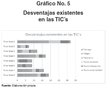 De acuerdo al Gráfico No. 5, se puede determinar que los docentes están convencidos que el uso de internet se confunde y mal utiliza para el plagio, debido a la sencillez para su copia y la poca consulta se realiza sin explotar las plataformas oficiales y bibliotecas digitales correctas este acto a futuro pueden tener consecuencias legales por el mal uso y violación de Derechos de Autor. Otro factor que se considera como desventaja es la poca interacción y consulta en las TIC's, es puede ser debido a que estudiantes y docentes no se encuentran capacitados o acostumbrados al uso de las TIC's en labores comunicativas académicas.