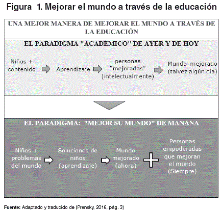 Es evidente que la educación es una de las áreas que más impacto ha tenido fruto de la incursión de las TIC y que "las bondades de sus características alcanzan su potencial cuando existe claridad (por parte de quien las incorpora) de ese papel mediador que cumplen en las relaciones presentes en el triángulo interactivo: estudiantes y contenidos; profesor y contenidos; profesor y estudiantes (UNESCO, 2016, pág. 10), por lo que se constituyen en el medio, mas no en el fin único del proceso educativo. En esa línea es que surgen tendencias en el mundo que pretenden reposicionar a la educación como el elemento que le permitirá al ser humano mejorar el mundo, como lo propone (Prensky, 2016) en la Figura 1, que habla de un cambio de paradigma, que pasa del enfoque tradicional en que se enfatiza en el aprendizaje por contenidos, a otro donde se priorice el aprendizaje a través resolución de problemas del mundo real, que permitirá cimentar un mundo mejorado con individuos que construyen su aprendizaje.