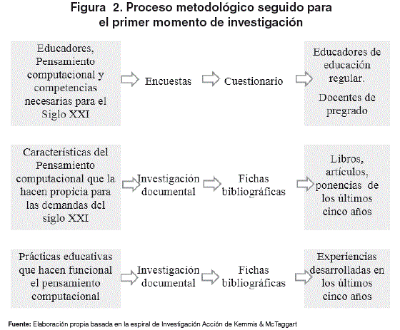 En este caso particular, la planificación está dada por la organización del material y la identificación de las unidades de análisis; la acción, por la aplicación de instrumentos, particularmente los cuestionarios que incluyen la definición operacional del Pensamiento Computacional; la observación, por el procesamiento y obtención de resultados, y la reflexión, por el análisis y discusión de éstos primeros resultados, que darán lugar a un nuevo ciclo de investigación.