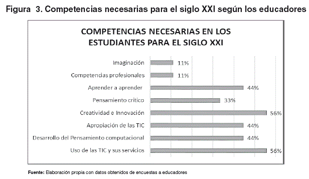 Fue necesario contextualizar a los educadores de educación regular y docentes del pregrado sobre las implicancias del desarrollo del Pensamiento Computacional en losestudiantes, particularmente en las formas de desarrollar su conocimiento, para luego consultarles si consideran importante desarrollarla como competencia, encontrándose que en términos generales un 67% expresa que está absolutamente de acuerdo en que es una competencia que se debe desarrollar, mientras un 33% está de acuerdo en desarrollarla, pero considera que existen limitaciones, toda vez que es una tendencia de reciente data y consideran que hará falta un proceso intenso de sensibilización. El proceso de contextualización fue necesario dado que al indagarse entre los educadores sobre las competencias que ellos consideran necesarias para ser desarrolladas en el siglo XXI los hallazgos destacan que el uso de las TIC y sus servicios es considerado prioritario, junto a la creatividad e innovación, aunque aparentemente el desarrollo del Pensamiento Computacional no resulta prioritario para los educadores, lo que se explica por la falta de familiaridad con el término y sus implicancias, es destacable que ocupa un lugar importante junto a la apropiación de las TIC y el aprender a aprender; así mismo surgen otras competencias como el pensamiento crítico y la imaginación, de ahí la importancia de contextualizar a los educadores sobre esta nueva competencia. En la Figura 3 se resume esta percepción de los educadores.
