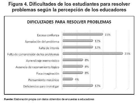Sin embargo, las percepciones recogidas de los educadores dan cuenta de que existen múltiples dificultades en los estudiantes a la hora de resolver problemas, así lo refleja la Figura 4, donde destacan la falta de comprensión de los problemas, la escasa confianza, seguidas de la apropiación del problema, la falta de interés y las deficiencias para investigar; éstas y otras dificultades pueden ser superadas a través del desarrollo del Pensamiento Computacional.