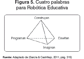 Es precisamente la Robótica Educativa, una de las prácticas educativas que permite platear problemas reales a los estudiantes para que estos puedan, imaginar soluciones, diseñar robots que los resuelvan, construirlos y programarlos, como se resume en la Figura 5, y mientras pasan por este proceso aprenden.