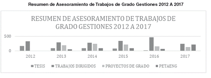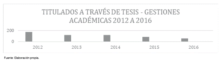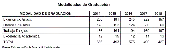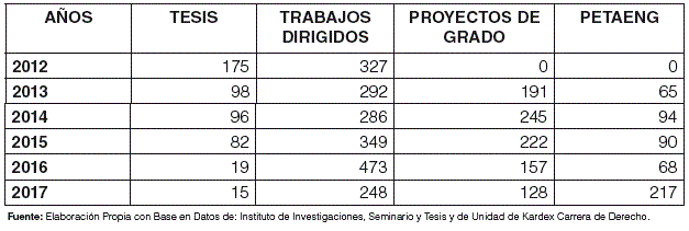 En la Carrera de Derecho, en las gestiones 2012 a 2016, existe un promedio de 580 egresados al año, de los cuales, de acuerdo a la modalidad de graduación, a la que se acogen los estudiantes, se consignan en los siguientes datos: