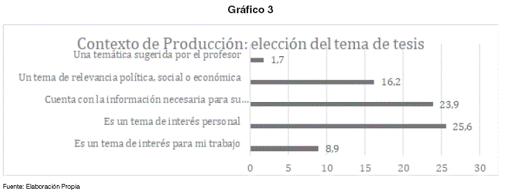 De acuerdo al Gráfico No. 3 respecto a la elección del tema de tesis, el estudiante debe ser quien esté motivado con lo que quiere investigar, y de acuerdo a la encuesta el 25 % de los estudiantes busca resolver e investigar un tema de interés personal, empero, también, con el 23.9 % de los encuestados, se ratifica que la fuente material de información es importante para fundamentar correctamente la investigación. Acá se ve la pertinencia de conocimiento del estudiante, ya que el 1.7 % no acepta de manera voluntaria una temática sugerida por el profesor, por lo cual es evidente que el verdadero fundamento de una investigación debe nacer de la motivación y aceptación de cada estudiante.