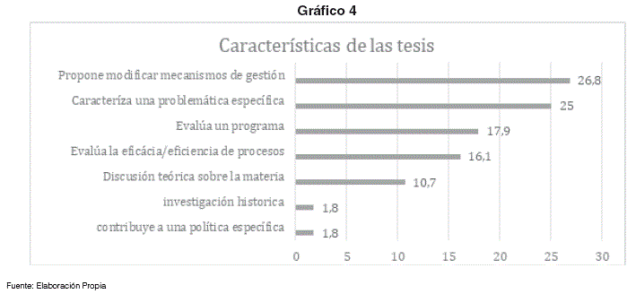El Gráfico No. 4 sobre las características de las tesis, se ratifica su fundamento de investigación, ya que el 26 % de los estudiantes comprenden que sus propuestas de investigación puedan modificar mecanismos de gestión, y resolver una problemática específica, ya que cada investigación debe ser comprendida que podrá ser aplicada para beneficio de la sociedad, empero con el 1 % comprenden también los estudiantes que la investigación posiblemente no contribuya a una política específica, y acá interpretamos que la tesis en nuestra realidad no tiene la posibilidad de poder ejecutarse ni realizarse como una Política Pública, ya que nuestras autoridades no demuestran un interés por investigaciones desarrolladas en la Carrera de Derecho de la UMSA y este aspecto es conocido por los estudiantes, y es por eso que la mayoría no eligen la tesis como una modalidad de graduación aceptada para su titulación.