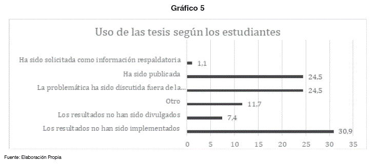 De acuerdo al Gráfico 5, respecto al tema central de nuestra investigación, sobre el uso de tesis según los estudiantes, el 30 % entiende que los resultados de una investigación no han sido implementados, por lo que no tendría repercusión ni aplicación para beneficio de la sociedad, siendo que el estudiante se propondría a elegir esta modalidad de graduación como es la tesis, es aceptada por que es publicada y resolvería una problemática que ha sido discutida fuera de la universidad, pero no ven una utilidad como información respaldatoria para futuras investigaciones. Todo esto denota que los estudiantes no están motivados para hacer una investigación, ya que no sería implementada y no tendría beneficio a futuro, lo cual ratifica los valores emitidos por anteriores gestiones donde se establece que los estudiantes que eligen hacer tesis son realmente escasos y cada año menos estudiantes eligen investigar.