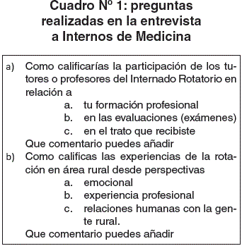 a tomar la parte cualitativa de la exploración señalada, que corresponde a la revisión y análisis de contenido de las ocho entrevista efectuadas a los internos, mediante un guion que constaba de 7 preguntas abiertas, dos de ellas intencionadas a detectar el Currículo oculto. Se procedió en una segunda etapa cuantitativa de datos, mediante la mensuración de los aspectos relacionados con el trato a los internos. El diseño contempla la definición de tres niveles cuantificables: aceptable, indiferente, no aceptable. A través del análisis de las respuestas logradas en la entrevista, se identificaron situaciones de currículo oculto negativo, que se consideraron necesarias a más de evidenciarlas, ser analizadas como parte de la transmisión de valores durante la práctica pre profesional de la cerrera de Medicina.