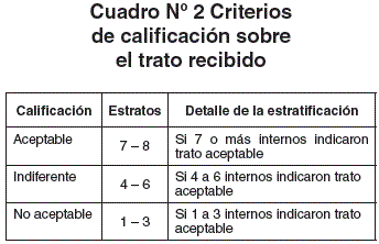 La identificación se situaciones relacionadas con el currículo oculto surgió de la revisión de las respuestas, acorde a las entrevistas se incluyeron cinco actores: docentes, residentes, licenciadas en enfermería, auxiliares de enfermería y otros internos, en el diseñó se repitieron los criterios considerados para el trato (aceptable, indiferente, no aceptable) con una estratificación especificada en el cuadro Nº 2. Para la tabulación de los datos, se incluyen las ocho entrevistas, discriminando la condición de los actores involucrados, que estaban incluidos en el registro de las respuestas.