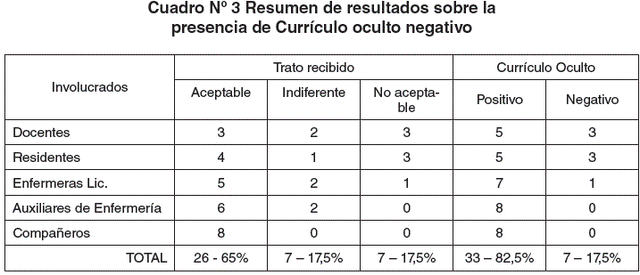 De los 8 participantes "todos" comentaron comportamientos displicentes en grados diversos por parte de sus superiores, esto determinó que de ocho entrevistas, discriminando a los involucrados con los internos, se logra tener 40 situaciones, cinco por cada interno participante, catalogándose como currículo oculto negativo aquel trato de docentes y residentes, 15% (6/40), se involucra una licenciada en enfermería 5% (1/40), el currículo oculto positivo corresponde a un 82,5% (33/40) se muestra el resumen en el cuadro Nº 3.