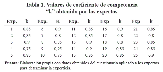 Se determinó la participación de 25 docentes de diferentes unidades académicas que están relacionados con la enseñanza de la Química los cuales obtuvieron coeficientes de competencia (k) en los rangos entre media y alta. (Tabla 1), este tamaño de la muestra es aceptable toda vez que el mínimo para este tipo de estudios es de 10 expertos según Hernández (2001). El cálculo para determinar el coeficiente de competencia se realizó con el archivo: Validación de propuestas método FM10, Selección de expertos, en formato Microsoft Excel.
