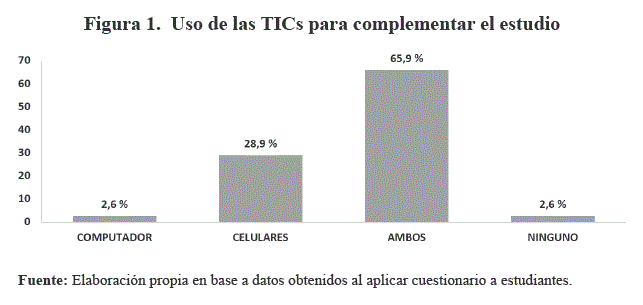 El taller realizado con los estudiantes referente al análisis de los simuladores y posterior aplicación del cuestionario, identificó que tienden a utilizar herramientas TICs como ser: computadoras y celulares en un 65,9% de manera simultánea para realizar sus trabajos académicos (Figura 1), indican que en la Facultad, el celular utilizan un 28,9% con frecuencia en las redes sociales como el Facebook, WhatsApp, mientras que en su domicilio utilizan el computador. En su totalidad los estudiantes consideran que utilizar simuladores en Química les ayuda a comprender de mejor manera la materia por ser práctico y motivador, así mismo consideran que tener simuladores en aplicaciones para celulares es recomendable por ser práctico y útil, que deben englobar los aspectos inherentes al tema desarrollado en la materia con el nivel y profundidad correspondiente de acuerdo al desarrollo del contenido temático pudiendo ser útil el simulador al analizar e interpretar resultados en teoría como en laboratorio.