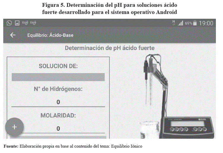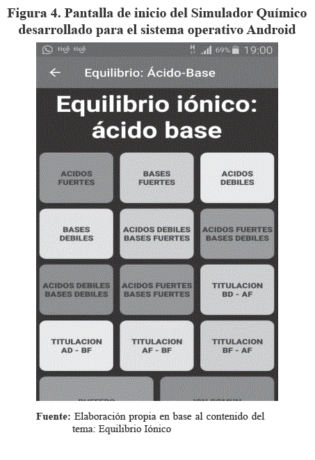 El Simulador Químico Equilibrio Iónico Ácido - Base fue construido con base al conocimiento que tenían los estudiantes sobre este recurso didáctico para lo cual se organizó un taller referente alos simuladores químicosy su utilidad práctica en el desarrollo del tema Equilibrio Iónico: Ácido - Base con la participación de 38 estudiantes de la materia de Química General de la Carrera de Ingeniería Agronómica Paralelo "C" de la Universidad Mayor de San Andrés, posteriormente se aplicó un cuestionario con la finalidad de conocer la percepción de los estudiantes respecto a los simuladores desde su criterio (Anexo N° 1). Con base a los criterios identificados y el contenido del tema Equilibrio Iónico: Ácido - Base de la materia de Química General, se realizó el trabajo en gabinete donde se diseñó y construyó el Simulador Químico, inicialmente utilizando el programa Microsoft Excel y posteriormente llevando a una aplicación denominado "SQ simulador químico v1.0 Equilibrio Iónico Ácido - Base" para celulares con sistema operativo móvil Android.