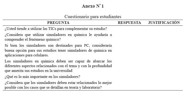 Cuando los criterios de valoración son: Poco adecuado o No adecuado se recomienda realizar el ajuste correspondiente en la propuesta, en el caso de la presente investigación obtuvieron en las 10 preguntas de valoración, criterios entre Adecuado y Bastante adecuado, lo que implica que el Simulador Químico desde el plano teórico puede ser considerado aceptado.