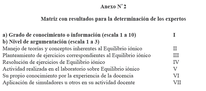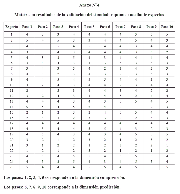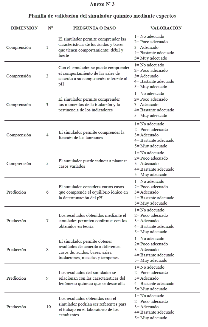 Una vez seleccionados los expertos, se les proporcionó una planilla de valoración con 10 preguntas o casos de valoración (Anexo N° 3), también se les proporcionó el Simulador Químico y una batería de ejercicios relacionados con el tema Equilibrio Iónico: Ácido - Base. Se aplicó el procedimiento de validación de propuestas por el método MF10 (Figueroa y Flores, 2010). Los criterios de valoración tienen la siguiente escala: Muy adecuado = 5; Bastante adecuado = 4; Adecuado = 3; Poco adecuado = 2 y No adecuado = 1.