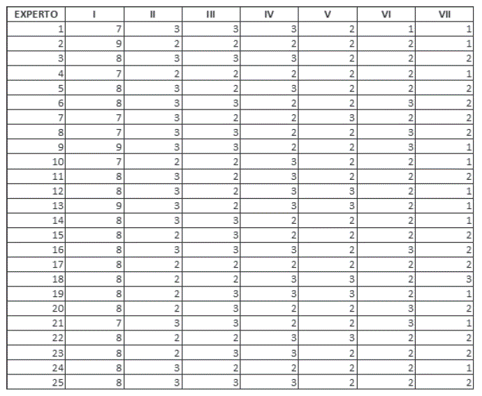 Los expertos son considerados en función de la experticia en el tema a valorar, el conocimiento y la actividad que desarrolla, es decir, la actividad empírica es importante debido a estar relacionado de manera directa en la actividad de estudio, sin ser determinante los grados académicos (Hernández, 2001), en este sentido, consideramos de mucha importancia la experticia que se obtiene mediante el ejercicio permanente en la enseñanza de la Química a nivel universitario, donde se puede identificarlos distintos problemas que los estudiantes tienen en el desarrollo académico de esta ciencia. Participaron en la investigación 25 expertos que alcanzaron un coeficiente de experticia satisfactorios entre 0,75 a 0,9 que para Fernández y López (2013) podemos considerar que los expertos tienen una competencia aceptable para analizar y emitir criterios considerados confiables para nuestra investigación.