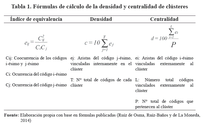 Para el análisis cuantitativo de los clústeres se vinculó el número de aristas del grafo, asociado a cada clúster, y el número de códigos del clúster, tanto en su vinculación interna como externa, a través de los indicadores de densidad (conectividad interna) y centralidad (conectividad externa). Posteriormente se calcularon la densidad de cada clúster y su centralidad mediante las siguientes fórmulas:
