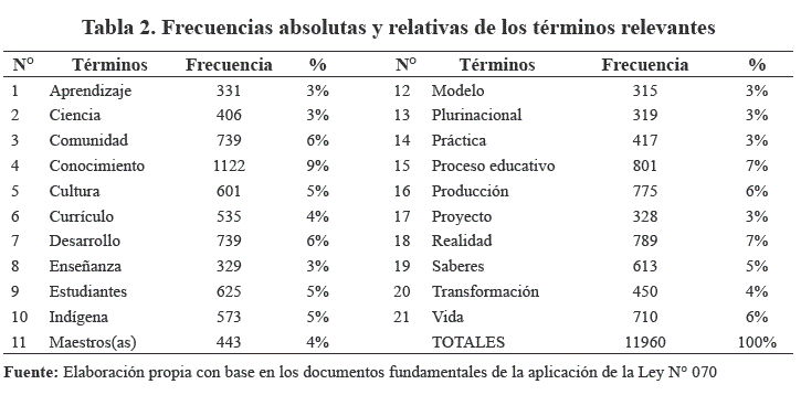 This paper aims at determining a system of codes and categories associated to the enforcement of the Law N° 070 Avelino Siñani - Elizardo Pérez, and parti cularly at determining the central category or the core of the concomitant educational proposal. That, on the basis of a corpus consisted of documents prepared as a guide for the enforcement of the Law. From a qualitative and a quantitative perspective, the methods used were the textual analysis (quantitative) complemented with a qualitative analysis in each stage. The techniques applied to this research were the lexicometrical and the matrix technique of grouping (clustering) applied to textual data. As a result, five clusters were obtained. They were identified as the following categories: 1) teaching and learning process, 2) socio-communitarian project, 3) educational model, 4) curriculum and 5) epistemological base. The last one turned out to be the central category or the core of the educational proposal, which, surely will contribute to direct future research reIated to the enforcement of the Law.