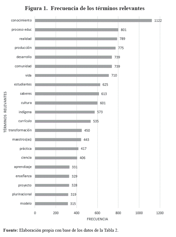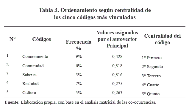 Se obtuvo como el código central al conocimiento, seguido de los códigos: saberes, comunitario y cultura; cabe hacer notar, que este ordenamiento no coincide con el de las frecuencias, lo que muestra que para que un código sea importante, no es suficiente una frecuencia elevada, sino el grado de conexión o relación con el resto de los códigos. Existe una mayor presencia de códigos asociados a lo cognitivo, lo comunitario y la cultura. En cuanto al código: realidad, presenta sus vínculos más fuertes con los códigos: conocimiento y transformación, en este último caso la asociación nos muestra la frase "transformación de la realidad" como recurrente, esta aparece 54 veces en el corpus textual. A continuación, se muestran los cinco primeros códigos en la Tabla 3.