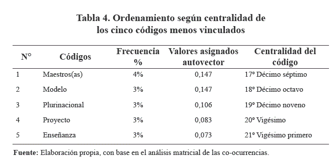 Entre los últimos códigos en orden de centralidad, están aquellos que figuran en los puestos vigésimo y vigésimo primero: proyecto socio-productivo y enseñanza, respectivamente. Lo que explica la escasa importancia que se otorgó a la actividad propiamente docente, en la aplicación de la reforma asociada a la Ley N° 070 Avelino Siñani - Elizardo Pérez; mientras que en el caso del proyecto socio - productivo, su introducción fue tardía (ME, 2017).