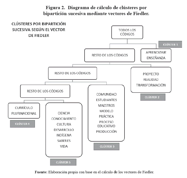 Se adoptó el método de agrupamiento mediante el vector de Fiedler, en vista de la optimización que representa en su aplicación, ya que minimiza el número de cortes que implica el proceso de agrupamiento. Este proceso (Kisner y Thomas, 2018) fue repetido cuatro veces, llegando a obtener cinco clústeres de códigos, estos agrupamientos fueron sometidos a un análisis cualitativo, remitiendo su significado al contexto de los códigos, a través de citas textuales. Se obtuvo como resultado de este análisis, el sistema de categorías emergentes del proceso de agrupamiento (Romero-Pérez et al., 2018).