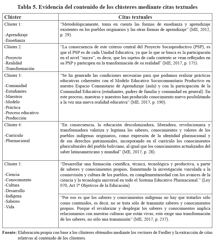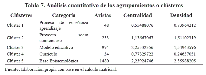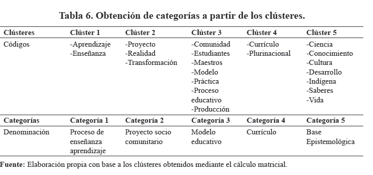 Del análisis de los códigos correspondientes a cada clúster, y de acuerdo a la contextualización mediante las citas extraídas, de las que se exponen solo ejemplos, se procedió a la construcción de las categorías. En este proceso se identificaron las siguientes categorías: proceso de enseñanza - aprendizaje (clúster 1), proyecto socio - comunitario (clúster 2), modelo educativo (clúster 3), currículo (clúster 4) y base epistemológica (clúster 5). Estas categorías se detallan en la Tabla 6: