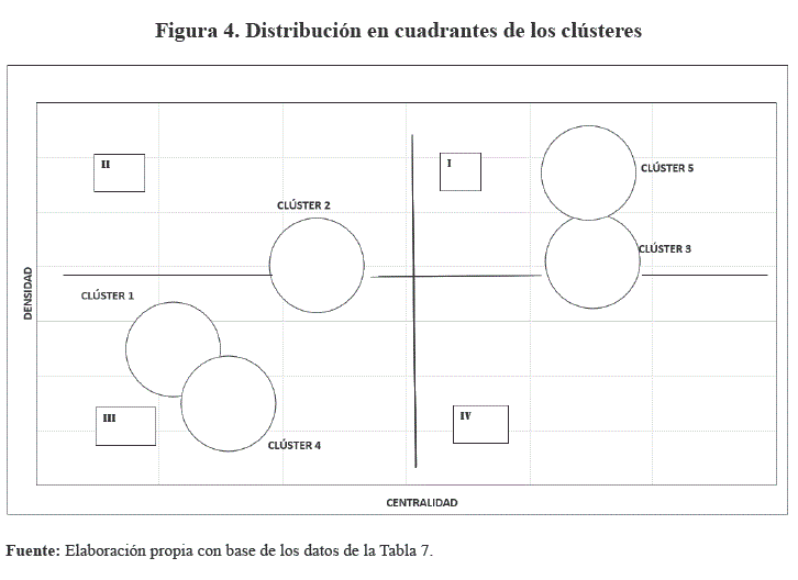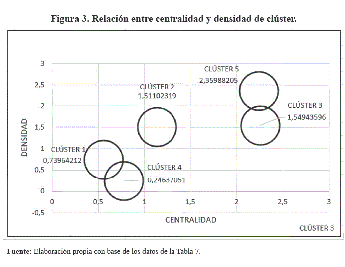 Se determinaron los grafos asociados y las sub-matrices de co-ocurrencia, para cada clúster, llegando a establecerse la influencia tanto interna como externa de cada uno, de acuerdo a cálculos de densidad y centralidad (Ruíz de Osma et al., 2014), los que se pueden apreciar en la Tabla 7 y Figura 3. Esto posibilitó mediante el gráfico de la Figura 4, establecer que la categoría: base epistemológica, correspondiente al clúster 5,