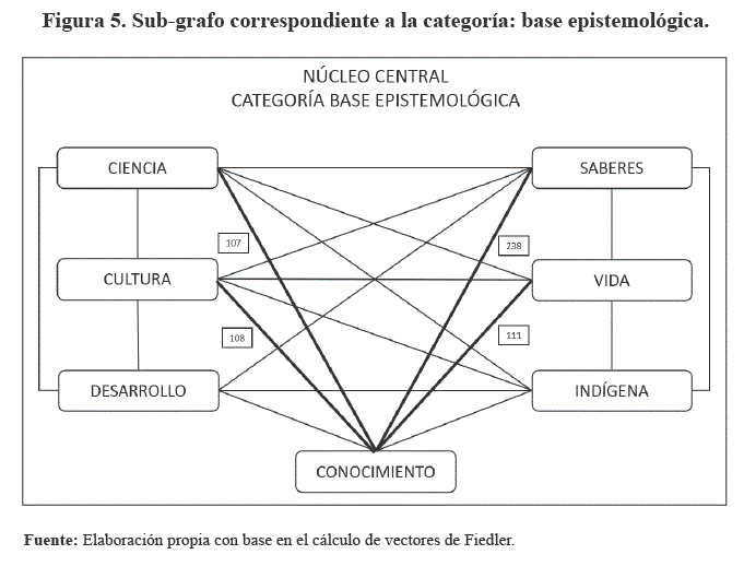De los datos tanto cuantitativos como cualitativos, obtenidos en el análisis del clúster, setiene a la categoría: base epistemológica, como el núcleo central de la propuesta educativa. En la Figura 5 se muestra el grafo correspondiente a la categoría central, en línea gruesa tenemos las aristas ponderadas con los enlaces más fuertes, entre los códigos que componen el clúster. Corresponde al código conocimiento, la centralidad dentro de la categoría, fuertemente vinculado con 238 co-ocurrencias con el código saberes, el cual alude al conocimiento generado por las culturas nativas.