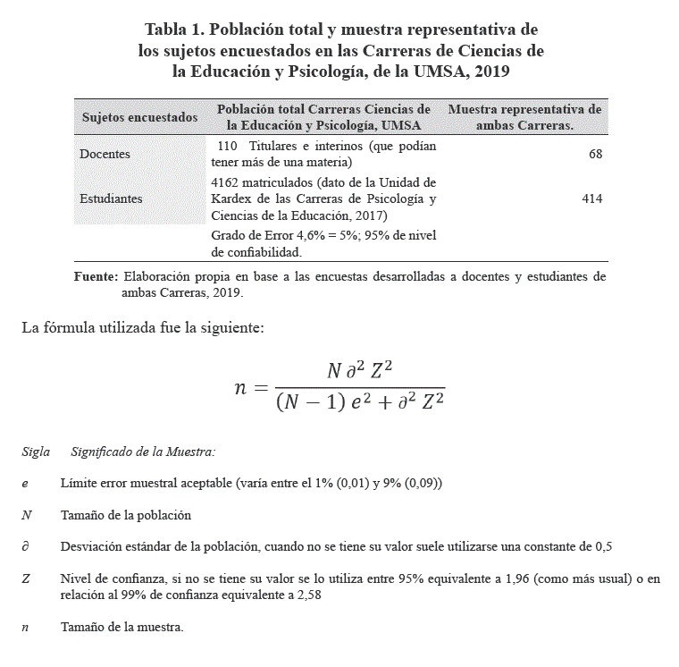 También, se utilizó la medición y la técnica de la encuesta directa, (tipo de muestreo probabilístico aleatorio simple) a estudiantes y docentes de las Carreras de Ciencias de la Educación y Psicología de la UMSA, con las siguientes características: