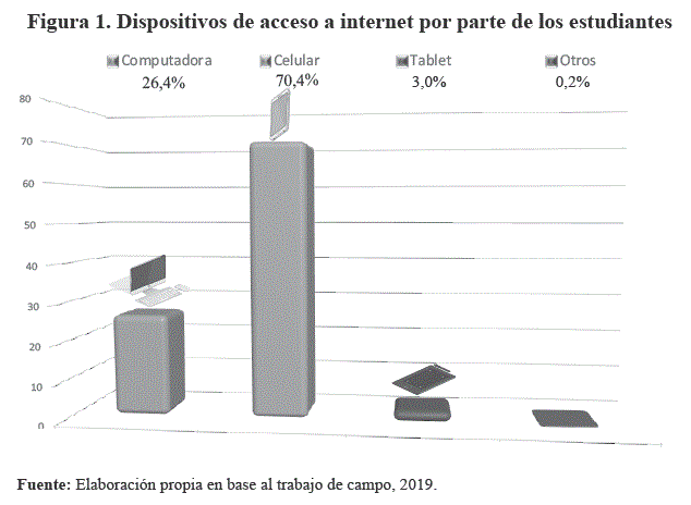 En relación a lo indicado anteriormente, en este estudio se evidencia, que, para los estudiantes, es el celular en un 70,4 %, el dispositivo más utilizado para todo tipo de uso, particularmente académico; en relación con la Computadora/laptop con 26,4% y la Tablet con 3.0% (Figura 1).
