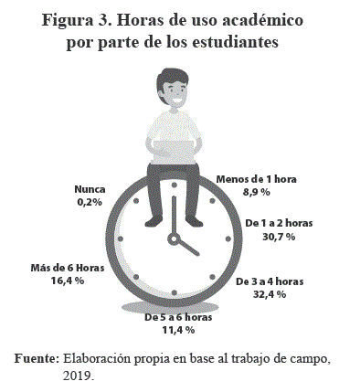Los estudiantes utilizan su celular o se conectan a Internet y todas sus aplicaciones, por más de 3 a 4 horas, en una proporción de 32,4%; seguido de un 30,7% de 1 a 2 horas; 16,4% más de 6 horas; frente al 8,9% de aquellos que vendrían a ser la minoría en utilizar el internet con menos de 1 hora (Figura 3).