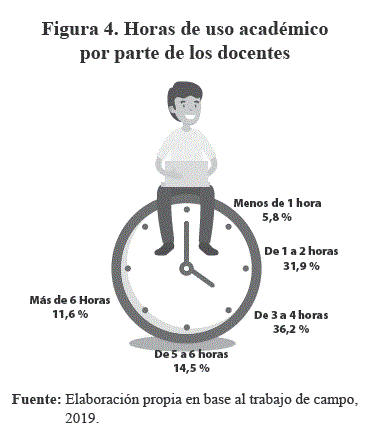 En el caso de los docentes, sus horas de uso son de 36,2% de 3 a 4 horas; seguido de 31,9%, de 1 a 2 horas; 14,5% de 5 a 6 horas; 11,6% más de 6 horas; y 5,8% menos de 1 hora. Los docentes indican que los estudiantes desperdician su tiempo "pegados a sus celulares", por la cantidad de horas de uso y que del mismo solo extraen información, que puede ser veraz o falsa "fake news" (Figura 4).
