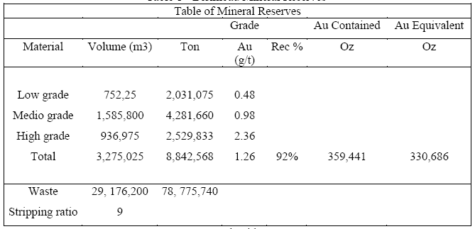The studies demonstrated thatthe Berimbau mine must be exploited using the open pit method. Based on the proposed Economic Exploitation Plan, the measured mineral reserves presented in the Table 1 were estimated. The main data for the open pit are: