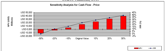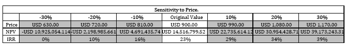 Table 3 and Figure 2 represent the sensitivity analysis of the price for predetermined valué (original valué) of USD 900.00/oz. It demonstrated that the project is viable until the price of 10% below the original valué.