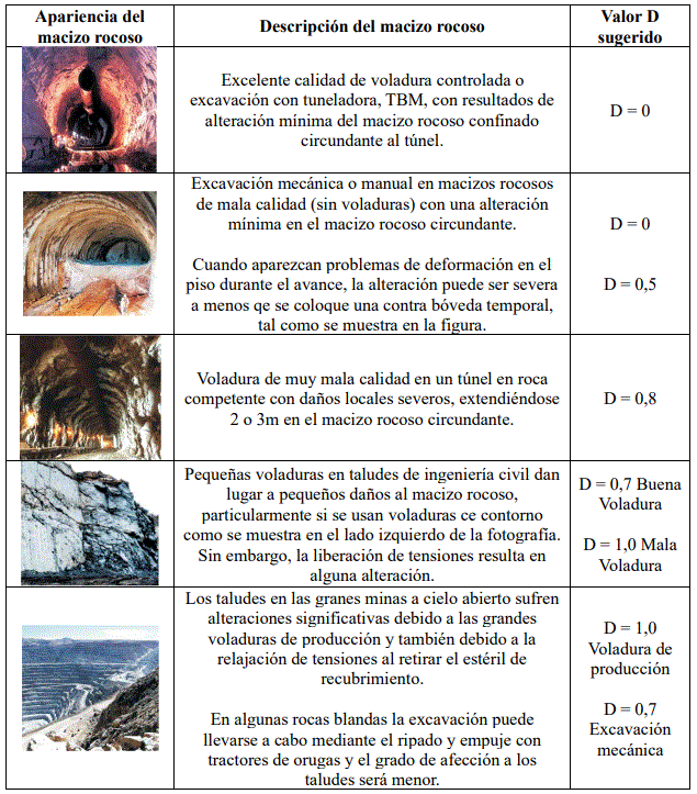 La Tabla 1 sugiere valores de D en base a las referencias citadas y otras tomadas en cuenta por Hoek et al. (2016) y Hoek y Brown (2019)