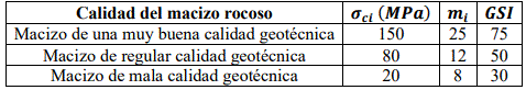 Tabla 2. Parámetros de los macizos rocosos evaluados.