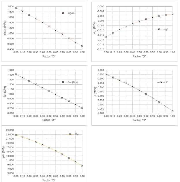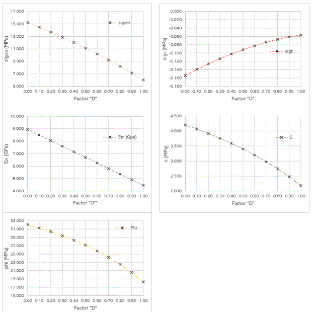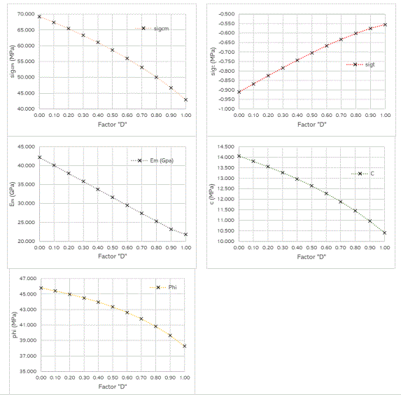 En las Figuras 1, 2 y 3 se puede apreciar cómo los parámetros calculados varían en función del factor de alteración "D" para distintos tipos de macizos rocosos. En todos los casos, se observa una disminución en los valores de los parámetros a medida que aumenta el valor de "D".