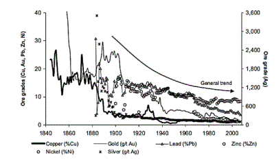 In a logn term period, there is a declining in average ore grades, as copper, gold, lead, zinc, uranium, nickel and sil ver (Fig. 1).