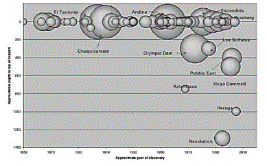 Figure 2.- Copper discoveries showing depth of deposits with greater than 4 Mt contained copper