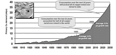 In parallel of the world population increase, the metal demand, for example copper, is projected to rise substantially with increasing industrialisation and urbanisation, from around 20 million tonnes perannum (mtpa) today to approaching double that figure in 2030 (Fig. 3).