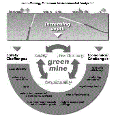 The economical challenges in the future deep mining requires higly innovative solutions, low or zero impact of undeground environment and zero accidents (social issues), that means, applying, for example, the green maine concept (safety, eco-eficiency and sustanability) and lean mining mininum environmental impact (Fig. 5).