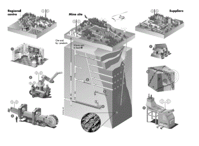 1. The control room receives online processed information from the rocks, from the personnel and from the machinery and equipment (sensors, cameras and inage techniques) that make it possible to control and perfect complete operations from resource characterization to the final product.