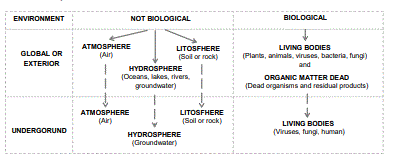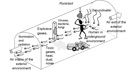 Similarly to global or exterior environment, the underground environment is defined as the medium with non-biological environmental components (underground atmosphere air, groundwater and rock) and biological components(viruses, bacteria, including the man himself).