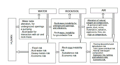 In similarity to the environment settings reviews, underground environment can be conceptualized as the underground space where takes place the interaction of the four environmental domains, which are: underground atmosphere, groundwater, rock and biological components (mainly human). In the underground environment, human is the most important biological component and its action causes negative environmental effects (direct or indirect), in like manner, humans are responsible for immediate, medium and long-term impacts in the underground environment and outer consequences, as the subsidence, wastes, acid water, etc. Similarly to what happens in the global or exterior environment, when human actions (underground mining) changes the natural conditions, it causes environmental impacts that can have severe negative consequences for human life (Fig. 11).