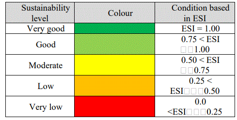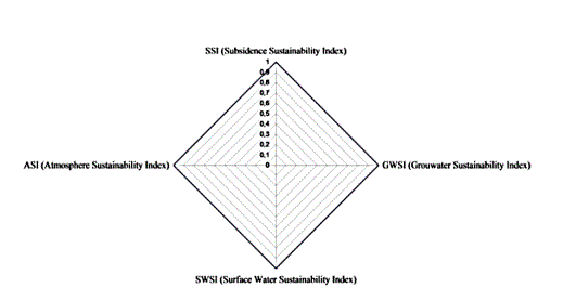 The developed ESI quantitative model is a function of four component indexes: Subsidence or Geotechnical Sustainability Index (SSI), Groundwater Sustainability Index (GWSI), Surface Water Sustainability Index (SWSI) and Atmosphere Sustainability Index (ASI). The calculation of these indexes considers the condition of sustainability of each pollutant based on threshold limit values, given by the existing standards.