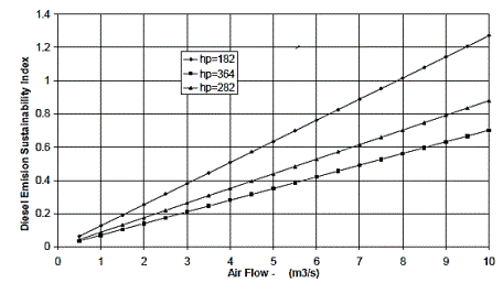 Other application of this Index is to the diesel emissions and the gas pollutions, simulated based on measured values results that show that there is bigger suatainability when there is bigger air flow and smaller power diesel equipment (LHD) (Fig. 17).