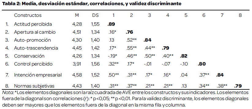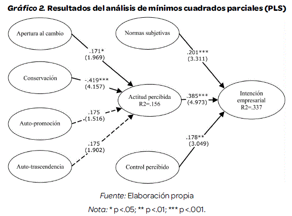 De hecho, las actitudes son el principal factor que explica la formación de las intenciones empresariales (P = 0,385; p <0,001); seguidas por las Normas Subjetivas (P = 0,201; p <0,001) y el Control Percibido sobre la creación de una empresa (P = 0,178; p <0,01). Sin embargo, tanto la dirección como la intensidad de estas actitudes son afectadas por el predominio de ciertos tipos de valores en la estructura de valores personales de los estudiantes.