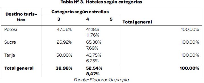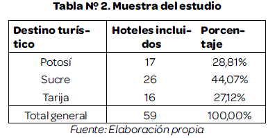 Con estos datos se construyó una base de datos donde se incluyeron 26 hoteles de Sucre, 17 hoteles de Potosíy 16 hoteles de Tarija.